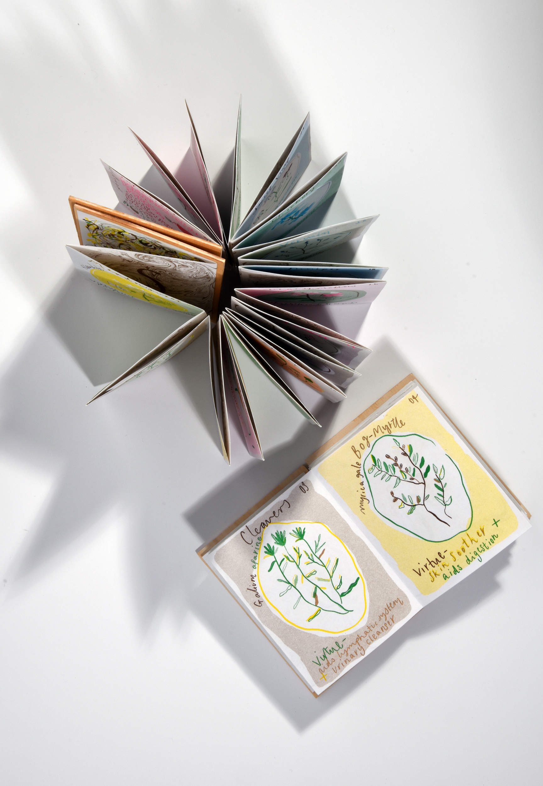 Risograph concertina book, plywood, cotton and muslin